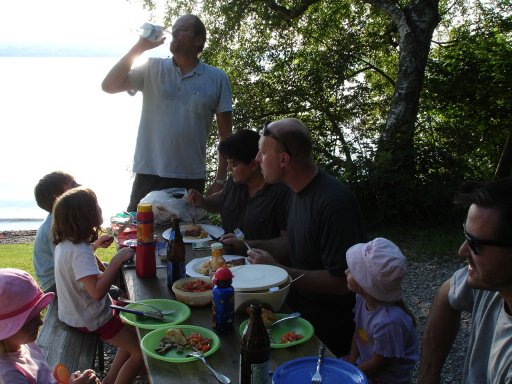 Endlich Super Wetter: wir grillen am See! Christl stellt Grill und Lavagestein, Jan karrt meine Bierbänke ans Ufer. So kanns losgehen.